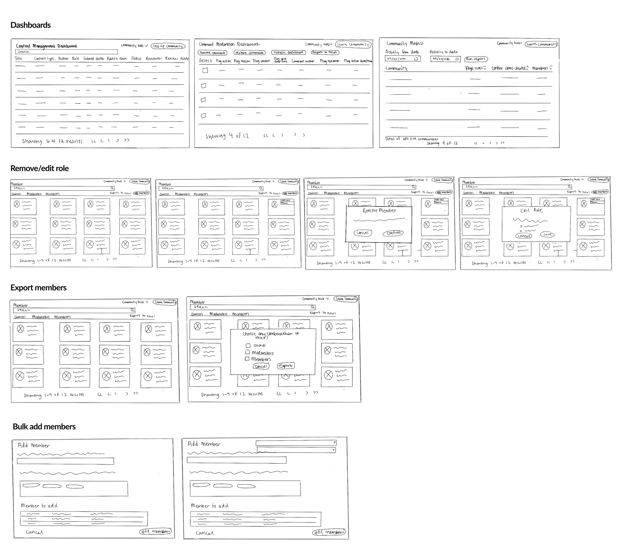 To ensure that I am able to accomplish all of our goals with this project and prioritize the user, I created 3 main user flows to outline the way that each task will be done. Before creating the final flows, we did some usability testing to ensure that all of the pain points of the users were touched on, and they were able to successful complete the task. The three main flows include: Dashboards, Member management & Adding members in bulk.